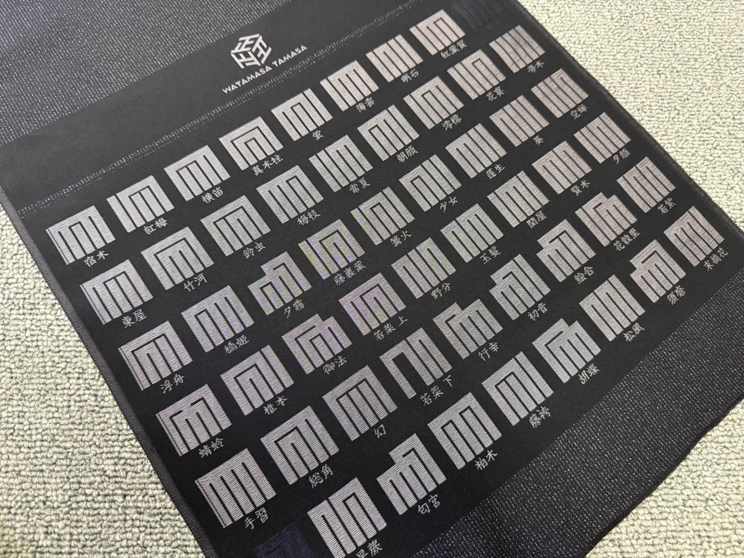52種類の源氏香を一つも同じものがないように、1反織り上げた御召です。紋紙に不備があり「若菜下」が一本足りず間違っているため、アウトレット価格で販売中です。