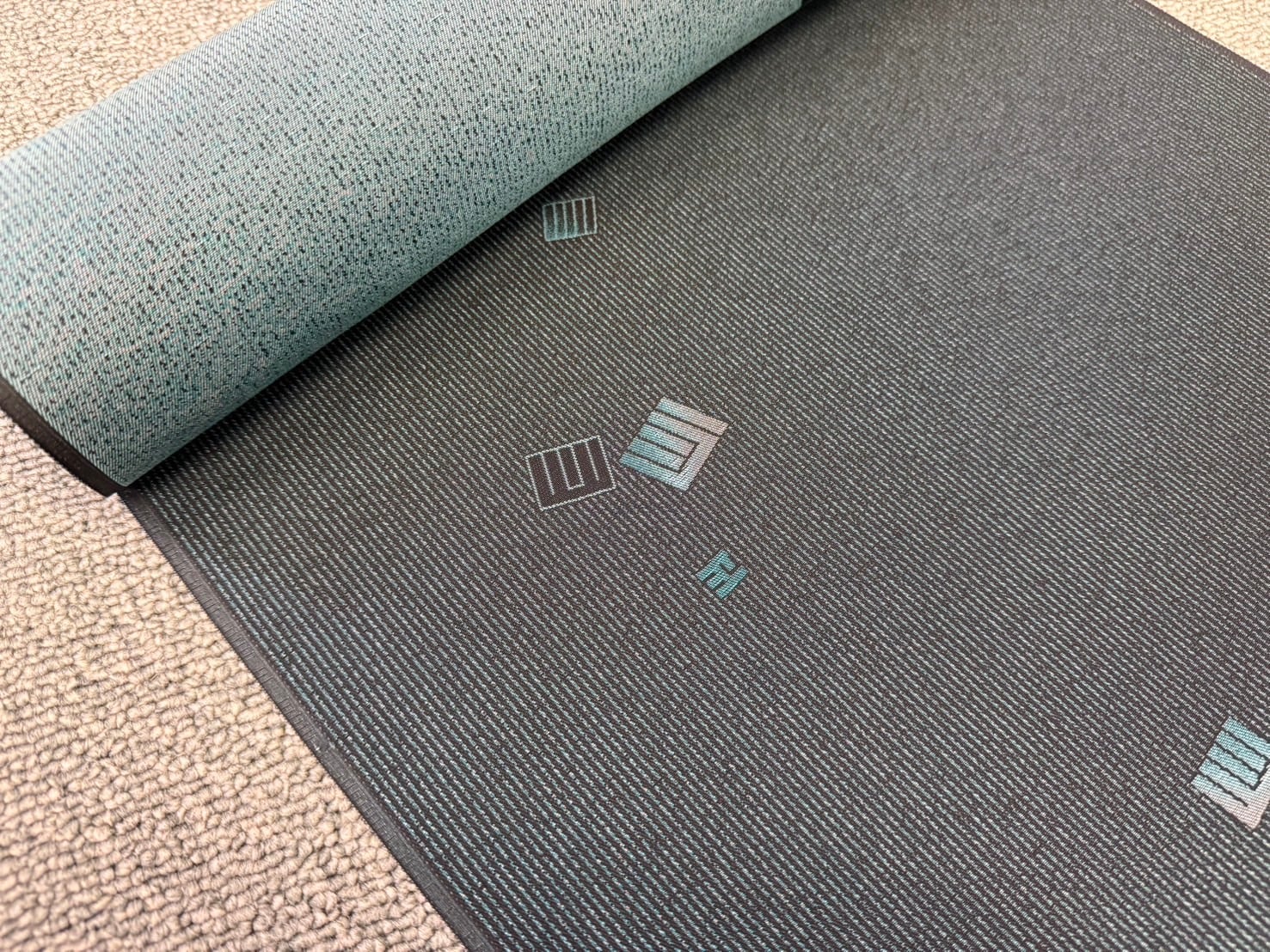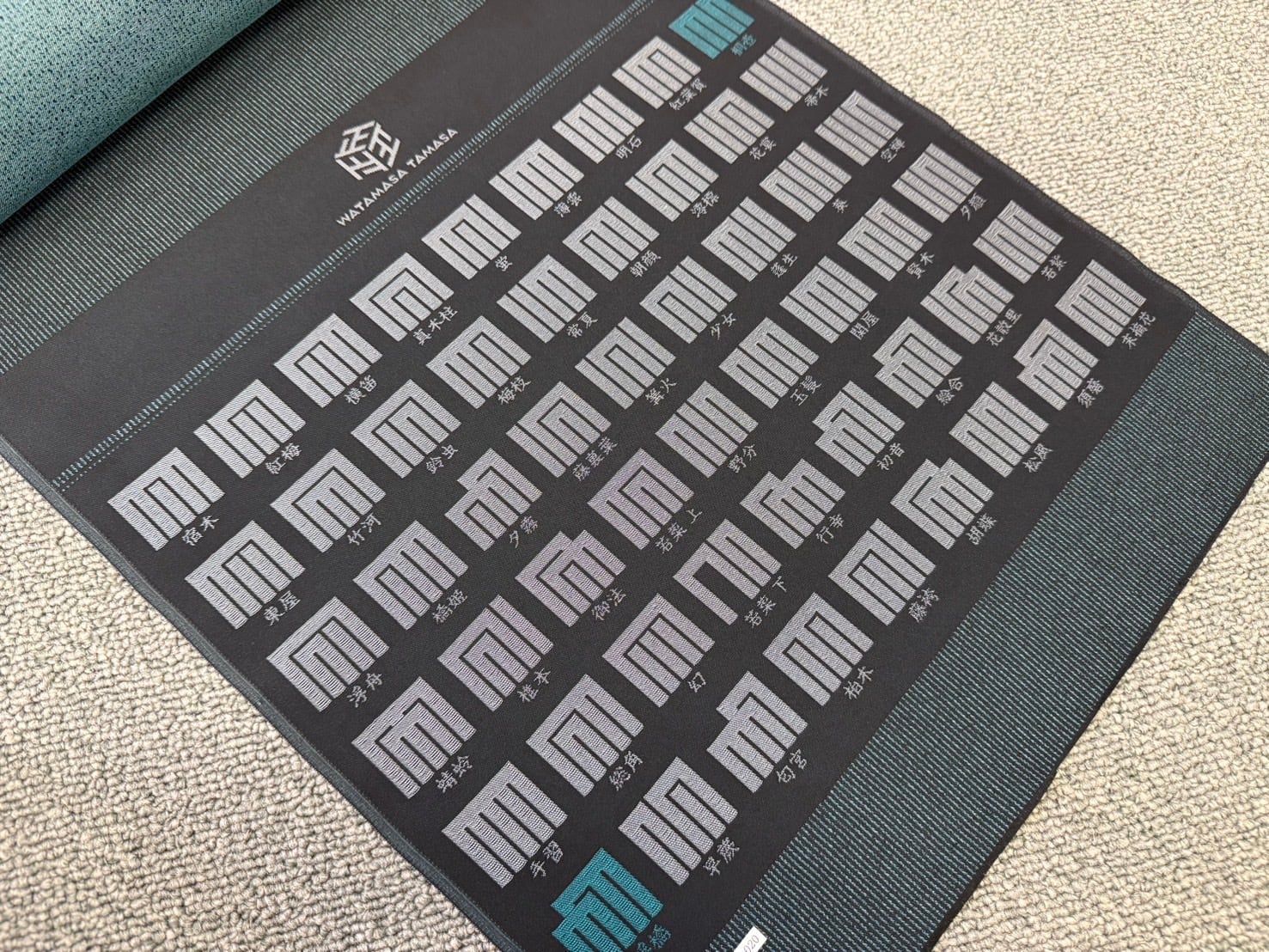 訳アリ洗える絹の御召「源氏香全通」黒×エメラルドブルー・水色(少々難あり)